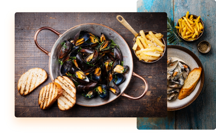 Nous vous proposons également des moules frites de juin à décembre. Ainsi, vous savourerez une variété de recettes : moules à la charentaise avec son Pineau des Charentes ou encore les moules au roquefort ou au safran.