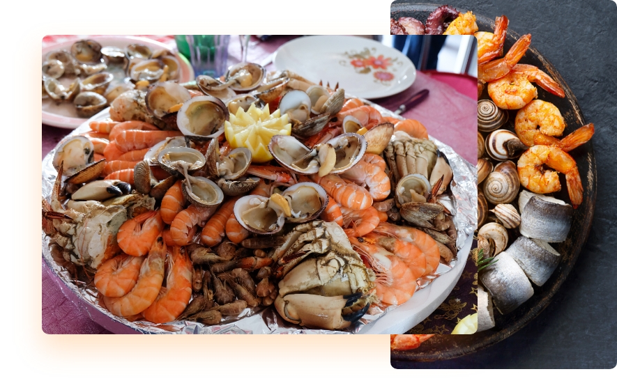 vous dégusterez des plateaux de fruits de mer à la cuisson impeccable, accompagnés d’un bon verre de vin : crevettes, huitres, langoustines, bulots, etc.